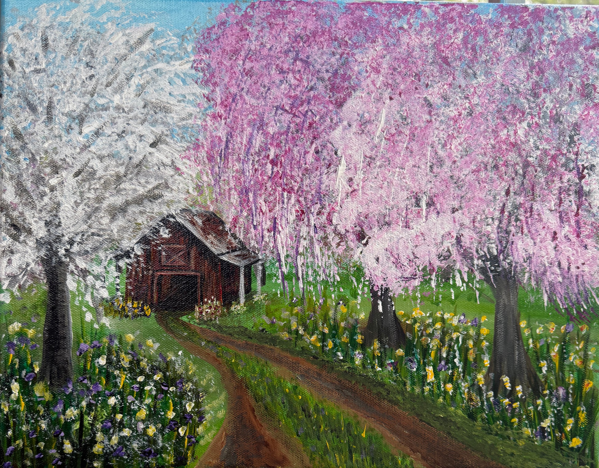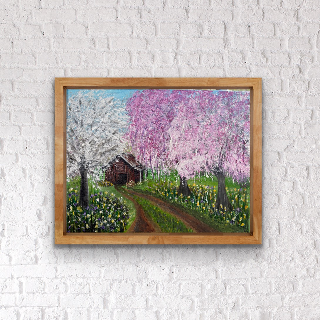 Capture the beauty of spring with this vibrant 11x14 acrylic painting. A rustic barn nestles between blossoming cherry and apple trees, their pink and white petals gently cascading like confetti on a lush, green path. Wildflowers in shades of yellow, purple, and white bloom abundantly along the winding trail, leading the eye into a peaceful countryside retreat. The bright blue sky overhead adds a cheerful, uplifting tone to the piece.